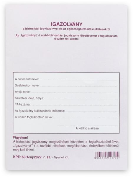 Igazolvány a biztosítási jogviszonyról és az egészségbiztosítási ellátásokról KPE160/A