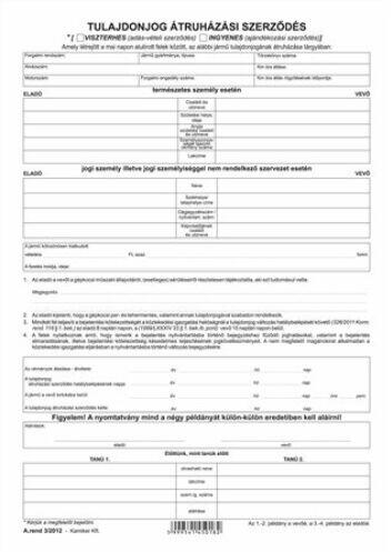 Tulajdonjog átruházási szerződés (adásvét. szer. gk), 4 példány, A4 - vegykezelt papír - A4 méret - 4 példányos - bizalmi vagyonkezelést tartalmazza - kitűnő átírás - kiszerelés: 200 garnitúra/csomag