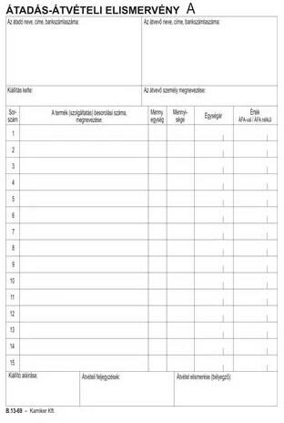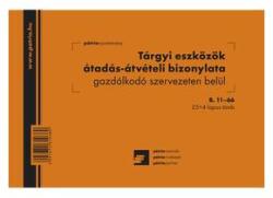 egyedi bizonylat a tárgyi eszközök gazdálkodó szervezeten belüli átadás-átvételéhez 25 x 4 lapos tűzött tömb méret: A/5 fekvő karton borító, perforált, indigó szükséges a lapok közé