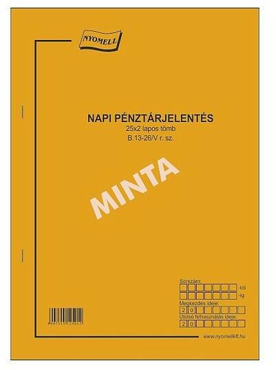 Pénztárjelentés nyomtatvány. Lapszám: 25, példányszám: 2. Méret: A/4. Formátum: álló. Kiszerelés: 20 tömb/csomag.