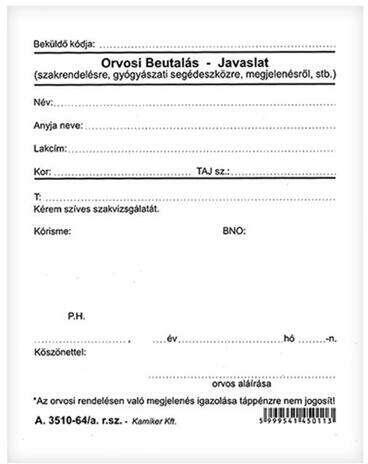 Orvosi beutaló-javaslat. A/6 méretű, álló.