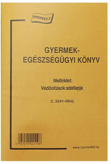 Nyomtatvány gyermekegészségügyi kiskönyv Gyermekegészségügyi kiskönyv. Méret: 120x170xmm, álló, 32 oldal+borító+védőoltások adatlapja 16 oldal. Minőségi belív, karton fedlap. Kiszerelés: 50 db/csomag.