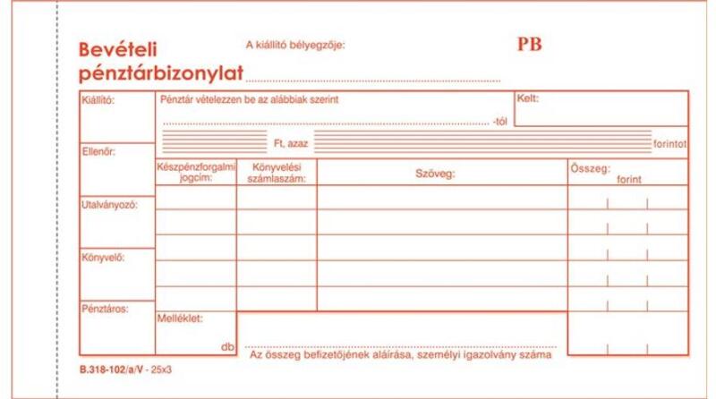 Bevételi pénztárbizonylat, 25x3, "B. 318-102"- kiváló átírás - kiváló perforáció - ellenőrzött minőség - kiváló ár-érték arány - kiszerelési egység tartalma: 10 tömb/csomag - kivitel : 25x3 lap - fekvő SZIGORÚ SZÁMADÁSÚ NYOMTATVÁNYOK RENDELÉSÉNEK FOLYAMATA A szigorú számadású nyomtatványok rendelése során az ügyfeleknek egy ún. meghatalmazást kell kitölt