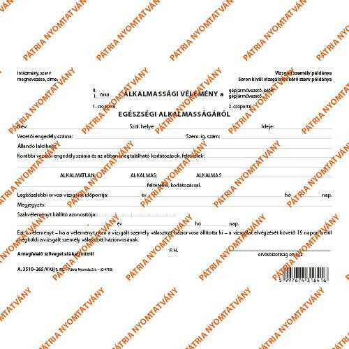 Alkalmassági vélemény a gépjárművezetői alkalmasságról 2 lapos garnitúra A/5 fekvő 2 lapos garnitúra A/5 fekvő