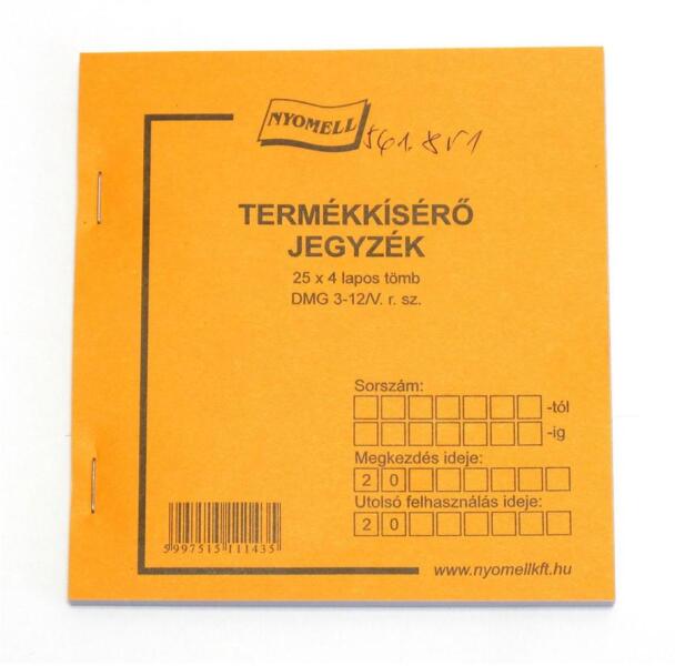 Termékkisérő jegyzék. 135x150 mm méretű, álló, 25 lapos, 4 példányos. Minőségi belív, karton fedlap.