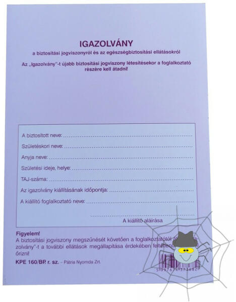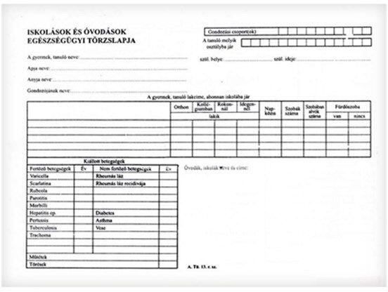 Iskolások és óvodások egészségügyi törzslapja. A/5 méretű, fekvõ, 24 lapos. Minõségi belívvel, karton fedlappal rendelkezõ nyomtatvány. Tartós tűzött kötéssel.