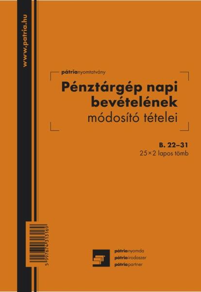 Pénztárgép napi bevételének módosító tételei 25x2 lapos tömb A/5 álló Pénztárgép napi bevételének módosító tételei 25x2 lapos tömb A/5 álló B. 22-31