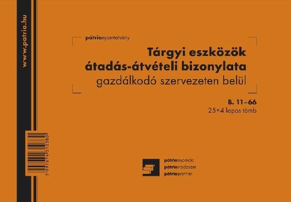Tárgyi eszközök átadás-átvétel bizonylat gazdálkodó szervezeten belül 25x4 lapos tömb A/5 fekvő Tárgyi eszközök átadás-átvétel bizonylat gazdálkodó szervezeten belül 25x4 lapos tömb A/5 fekvő B. 11-66
