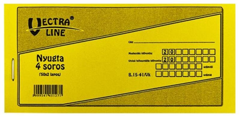 Nyugta. 140x75mm méretű, fekvő, 50 lapos, 2 példányos, 4 soros. Minőségi belívvel, karton fedlappal rendelkező nyomtatvány. Tartós tűzött kötéssel és perforációval rendelkezik. Kiszerelés: 1000 ív/csomag. Szigorú számadású nyomtatvány.