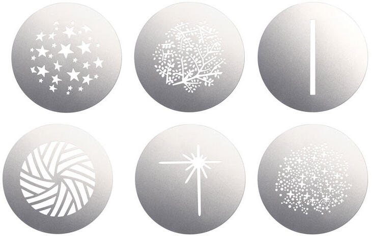 6 x Gobo a Spotlight Attachment-hez Különböző minták kivetítését teszi lehetővé A Godox Gobo Set VSA-GS3 egy újabb kiegészítő a sokoldalú vetítőfelszereléshez. A 6 gobóból álló készlet bármilyen kreatív munkához, például színházhoz, videóhoz, filmhez vagy divathoz személyes hangulattal járul hozzá. A készlet olyan gobókat tartalmaz, mint egy kerék, egy csillag