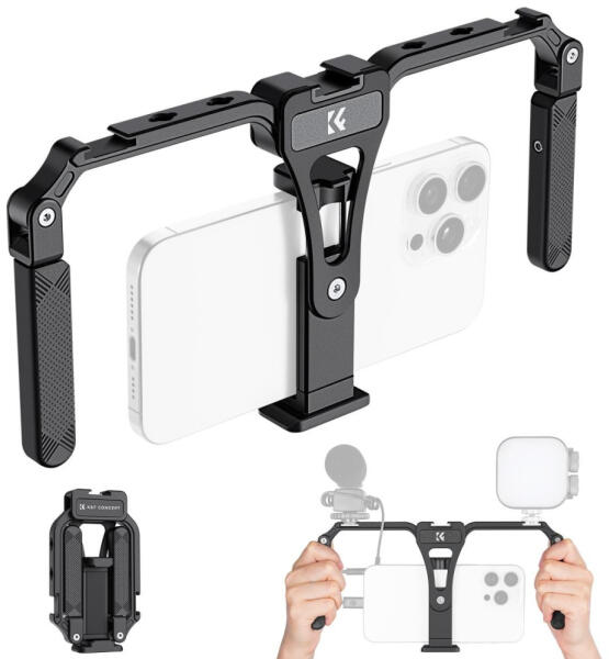 K&F Concept Okostelefon Rig-cage -CNC Videó Vlog Rig Az okostelefon cage egyedülálló tervezési koncepciót alkalmaz. Összecsukva könnyedén átalakítható okostelefonná. Nagyon kompakt és hordozható. Mindössze 232 g a súlya. Könnyű tárolni, könnyen hordozható és használható. Utazás során, szabadtéri tevékenységek alkalmával vagy mindennapi használatban is könnyedé