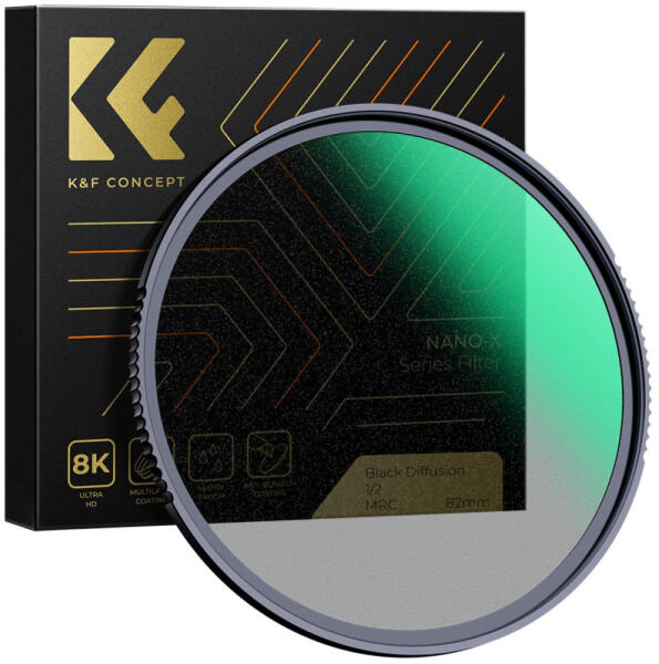 K&F Concept Black Mist 1/2 Diffúzió Szűrő 49mm - Nano-X cirkuláris mist black filterA K&F Concept 1/2-as Black Mist szűrője lágyabbá teszi a képet vagy a videót finomabbá téve a bőrt vagy a pórusokat, a kétoldalas polírozási technológia pedig nagy felbontást biztosít. Filmszerű megjelenést kölcsönöz, és gyakran használják a ráncok, foltok tompítására és mo