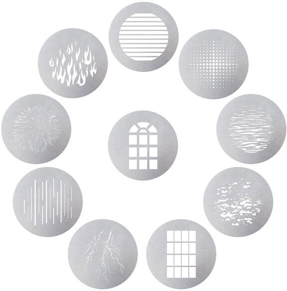 Tíz GOBO alakzatot tartalmaz: "Tűzijáték", "Lineáris", "Pötty", "Templomablak", "Modern ablak", "Tűz", "Szóródás", "Villám", "Hullámzás" és "Rács". A Light Storm LC 120d II, 120D és 300D projektorhoz tervezett Spotlight 10-Piece Gobo Kit az Aputure-tól lehetővé teszi, hogy a Spot Light lámpával felszerelt lámpák B méretű (3,4") mintákat vagy képeket vetítsenek a 10 gobo