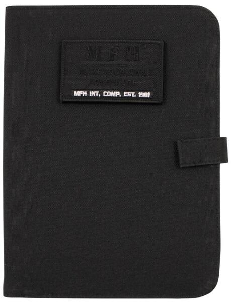 Jegyzetfüzet, A5, fekete előlappal, hurokkal, kb. 8 x 5 cmés levehető "MFH" felirattal1 oldalsó kampós és hurkos rögzítővel6 becsúsztatható rekesz2 tolltartó1 kivehető gyűrűs iratgyűjtőpapírral együttMéretek: kb. 24 x 17,5 x 3 cmAnyag: Mesterséges anyag: Anyag: 100 % poliészter