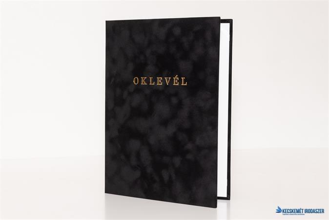 A4 méretű oklevelek tárolására alkalmas, plüss borítás, nyitott állapotban, jobb oldalon 4 szatén szalaggal. A borító előlapján arany színű "Oklevél" felirattal. Méret: 233x312x7mm