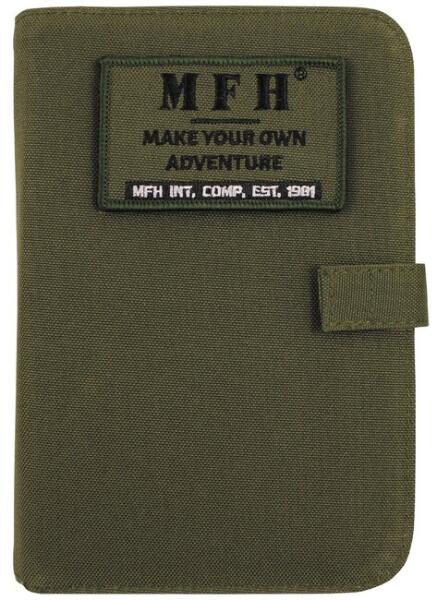 Jegyzetfüzet, A6, OD zöld előlappal, hurokkal, kb. 8 x 5 cmés levehető "MFH" felirattal1 oldalsó kampós és hurkos rögzítővel6 becsúsztatható rekesz2 tolltartó1 kivehető gyűrűs iratgyűjtőpapírral együttMéretek: kb. 20 x 14 x 3,5 cmAnyag: Mesterséges anyag: Anyag: 100 % poliészter