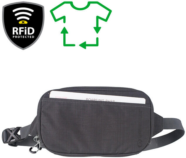 Az RFiD Travel Belt Pouch egy újrahasznosított anyagból készült praktikus utazótáska, amely alkalmas úti okmányok tárolására. A belső rekesz RFiD-védelemmel van ellátva, amely az RFiD-jelzéssel szemben gátként működik. Ez jelentősen csökkenti az elektronikus személyazonosság-lopás kockázatát.