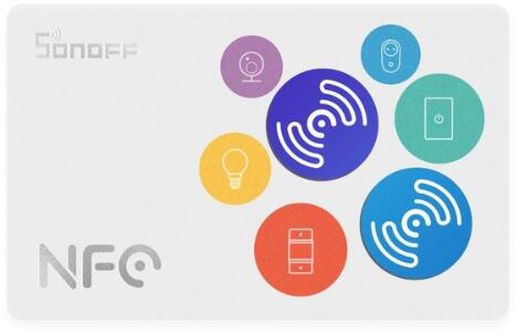 Két darab, öntapadós hátsó oldallal ellátott NFC címke található a Sonoff plasztikkártyáján, mely egy NFC-képes telefon segítségével beállítható eWeLink automatizációk (jelenetek) futtatására. Konfigurálás után az NFC-s telefon érintésével lefut az automatizáció, így az NFC-s technológia segítségével a telefon elővétele és az eWeLink app futtatása nélkül i