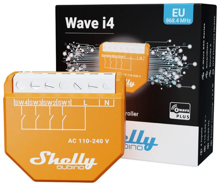 A Shelly Qubino Wave i4 okosmodulban nincs relé, de akár 4 db kapcsoló állapotát érzékelve vezeték nélkül képes vezérelni más Shelly Wave reléket. Használják fali kapcsolóról indított jelenetek vezérlésére és vezeték nélküli kapcsolás kialakításához is. Z-Wave 800 eszköz, így szükség van a vezérléséhez egy Z-Wave hub-ra vagy USB koordinárorra. A Shelly Qubino