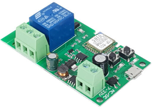 A SmartWise (Sonoff kompatibilis) 5-32V-os tápfeszültségű WiFi-s kapcsolója, impulzus kapcsolási és normál kapcsolási üzemmóddal, száraz kontaktus kapcsolással is, műanyag védőtok nélkül.