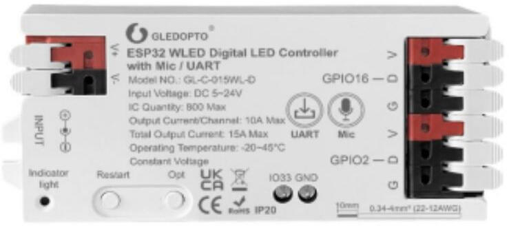 A Gledopto GL-C-015WL-D a korábbi GL-C-010WL-D típus új változata. Ez a WLED IC LED-szalagos vezérlő beépített ESP32 chippel rendelkezik, és kompatibilis az 5V-24V DC tápegységgel működő IC LED szalagokkal. A maximális kimeneti teljesítmény ebben az új típusban 15A-re növekedett. Beépített mikrofonja és micro-B portja van a firmware módosításához. A Gledopto GL-C-015WL-D
