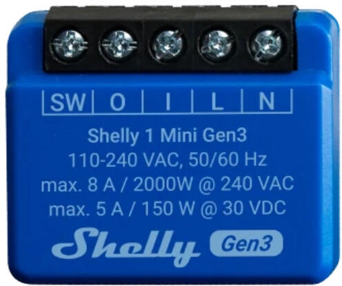 A Shelly PLUS 1 MINI GEN3 a Shelly PLUS 1 mini-nek a továbbfejlesztett verziója. A Shelly Plus 1 mini-hez hasonlóan kis méretű és azzal megegyező teljesítmény kapcsolására képes, 8A maximális áram kapcsolását képes ellátni, ideális választás kontaktus vezérléséhez . A különbség elődjődjéhez képest, hogy a Shelly saját fejlesztésű chipjét alkalmazzák benne. A mod