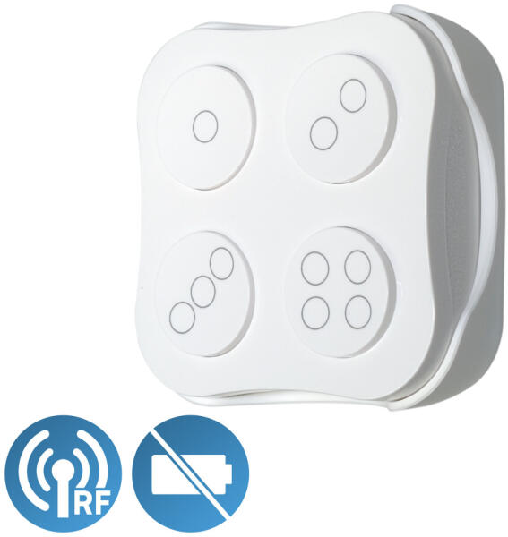 — A nyomógombok felhasználói igények alapján lézer gravírozással — Kisméretű, hordozható kialakítás, IP44 védettség — Tápellátás: a nyomógomb kinetikus energiája (Elem és külső tápellátás nélkül működik) — Élettartam: > 200000 kapcsolás — Rádiófrekvencia: 433 MHz — Átviteli távolság: 80 m (kültér), 25 m (beltér) — Kompatibilis: KRC-101/102/1