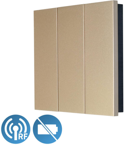 — 6 csatornás nyomógomb stílusú adó — Működési mód: Ki/Be/Dimmelés/jelenet — Felületre szerelhető, felhasználóbarát, vékony kialakítás — Tápellátás: a nyomógomb kinetikus energiája (Elem és külső tápellátás nélkül működik) — Élettartam: > 200000 kapcsolás — IP44 védettség — Rádiófrekvencia: 433 MHz — Moduláció: FSK — Átviteli távolsá