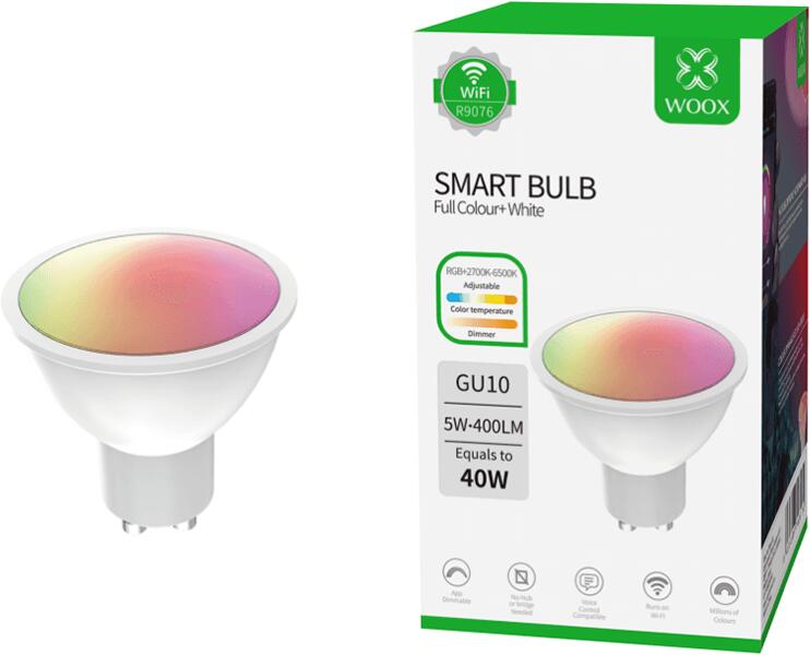 GU10 foglalat, RGB+CCT 2700-6500K színhőmérséklet, WIFI IEEE 802/11b/g/n 2,4Ghz, Amazon Alexa és Google Assistant hangvezérlés