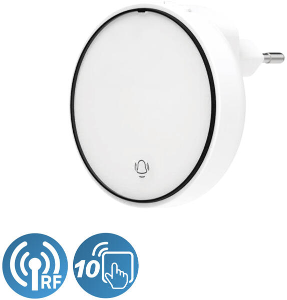 — Állítható hangerő (4+1 lépésben) és csengési dallam (38 db) — RF: 433 MHz (FSK kódolás), hatótáv: max. 100 m (kültér), 25 m (beltér) — Max. 10 db RF kinetikus /csengőgombkapcsoló csatlakoztatható — Működési hőmérséklet: -20°C ~ +55°C — Tápellátás: 100-240 V AC, 50 Hz — Méret: 75 x 22 mm — Állítható hangerő (4+1 lépésben) és csengési dallam (38