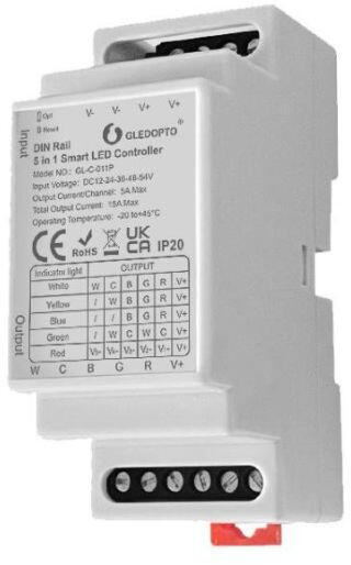 Ez a Gledopto Pro professzionális, Zigbee 3.0 + RF vevős LED vezérlési termékcsaládjának csúcsmodellje, villamossági szekrény DIN-sínre szerelhető verzióban. 5 féle üzemmódban is képes működni: RGBCCT, RGBW, RGB, CCT (WW/CW) és Dimmer, és 12V / 24V / 36V / 48V / 54V DC LED-eket is képes vezérelni a LED típusához illő funkciókkal (szín beállítása, fehér fény esetén