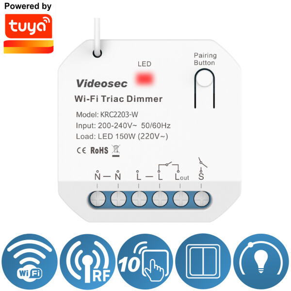 KRC211-W új típusa — Hagyományos nyomókapcsoló is csatlakoztatható — A beépített kettő FET-es megoldásnak köszönhetően kompatibilis a mindkét típusú (felfutó és lefutó élre reagáló) LED lámpákkal is — Mobil applikáción keresztül is vezérelhető (Tuya) — Wi-Fi szabvány: 802.11b/g/n, 2.4 GHz — Tápellátás: 100-240 V AC, 50 Hz — Szabályzott kimenet: 1 db, m