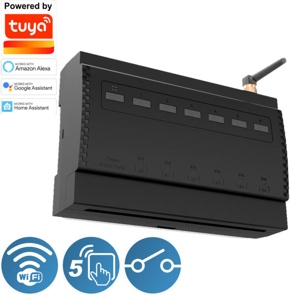 — 6 csatornás vevőegység Wifi kapcsolattal — Mobil applikáción keresztül is vezérelhető (Tuya) — Amazon Alexa és Google Assistant kompatibilitás — DIN sínre szerelhető — Tápellátás: 100-240 V AC, 50/60 Hz,