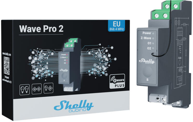 A Shelly Qubino Wave Pro 2 egy 2 áramkörös, DIN-sínre szerelhető okosrelé. A vezeték nélküli Z-Wave okosotthon protokollt támogatja, távoli vezérléséhez és integrálásához Z-Wave átjáró szükséges. Használható akár kétirányú motorok vezérlésére vagy 2 áramkör akár potenciálmentes kapcsolására is. Professzionális 2-csatornás DIN sínre szerelhető Z-Wave® okos