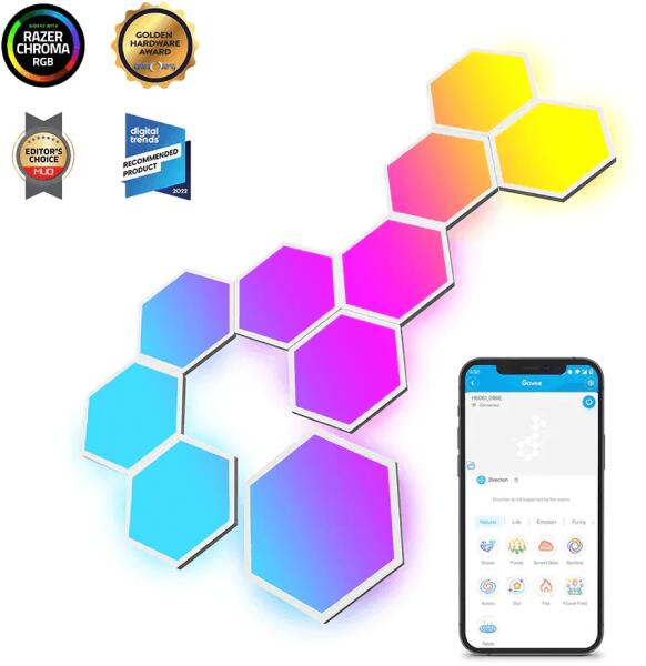 Govee Glide hatszögletű fénypanelek H6061 modell színek RGBIC Vezérlési módszerek App, Control Box, Hangvezérlés App csatlakoztathatósága 2.4GHz Wi-Fi + Bluetooth Feszültség 24 Volt Fogyasztás 36 Watt teljesítmény 36 Watt Különleges jellemzők40+... Govee Glide hatszögletű fénypanelek H6061 modell színek RGBIC Vezérlési módszerek App, Control Box, Hangvezérlés App csatla