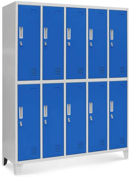 Fém szekrény 9 dobozzalFém szekrény - 9 doboz, hengerzár A fém szekrényben 9 különálló doboz található 3 × 3-as elrendezésben. Mindegyik elegendő tárolóhelyet kínál személyes tárgyak és ruhák számára - 29 × 58 × 42 cm ( szélesség x magasság x mélység). A dobozok ajtaja szellőzőnyílásokkal van ellátva, aminek köszönhetően könnyű a levegőáramlás. Megakad