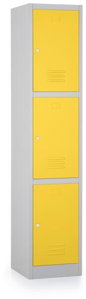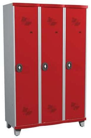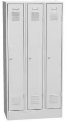 3 hosszúajtós fém öltözőszekrény rekeszenként polccal és akasztóval . 150 mm magas teli lábazat on álló, jobbra nyíló ajtós kivitel , szürke színben. 1 mm-es acéllemez ből hajlítással és hegesztéssel gyártott. Szellőzőnyílások és címketartó az ajtón. Rekeszenként fémbetétes cilinderzár ral és 2 db kulccsal szállítjuk. Porszórt ráégetett (színterezett) fe