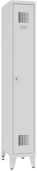 Hegesztett öltözőszekrény 0,7 mm vastagságú acéllemezből. Akasztórúddal. Egypontos hengerzárral zárható, két kulccsal. A belső tér hatékony szellőzését biztosító perforált ajtón névcímke elhelyezhető.