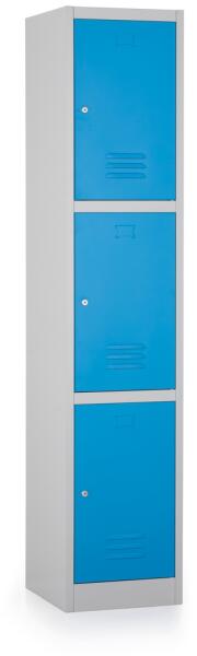 Fém szekrény 3 dobozzalFém szekrény - 3 doboz, hengerzár A fém szekrényben 3 különálló doboz található egymáson. Mindegyikben elegendő tárolóhely található személyes holmik és ruhák tárolására. A dobozok ajtaja szellőzőnyílásokkal van felszerelve, amelyeknek köszönhetően könnyű a légáramlás. Megakadályozzák a kellemetlen dohos szag megjelenését. Minden ajt