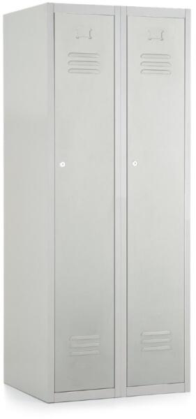 Acial szerelt öltözőszekrény acéllemezből két külön rekesszel. 180°-ban nyíló ajtó. Mindegyik rekesz tartalmaz egy akasztórudat két ruhaakasztóval. Hengerzárral zárható, két kulccsal.