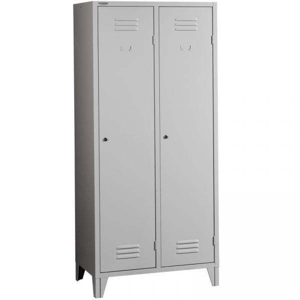 2 hosszúajtós fém öltözőszekrény rekeszenként polccal és akasztóval . 120 mm magas rozsdamentes l ábak on álló, jobbra nyíló ajtós kivitel , szürke színben. 1 mm-es acéllemez ből hajlítással és hegesztéssel gyártott. Szellőzőnyílások és címketartó az ajtón. Rekeszenként fémbetétes cilinderzár ral és 2 db kulccsal szállítjuk. Porszórt ráégetett (színterez