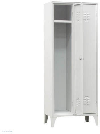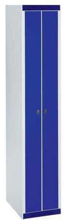 Acial szerelt öltözőszekrény acéllemezből két külön rekesszel. 180°-ban nyíló ajtó. Mindegyik rekesz tartalmaz egy akasztórudat két ruhaakasztóval. Hengerzárral zárható, két kulccsal.