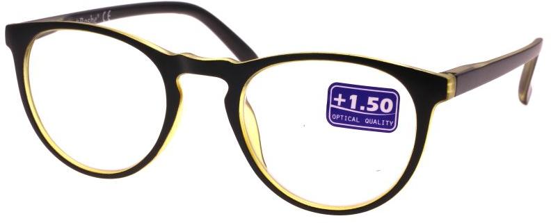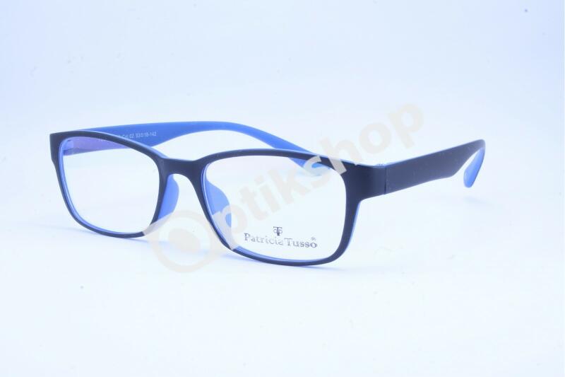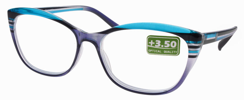 Műanyag szemüvegkeret, divatos forma fekete - kék színben.