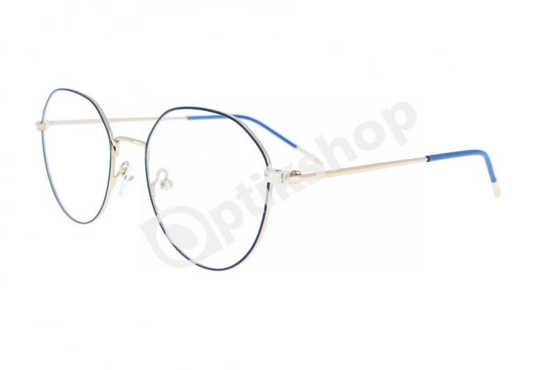Modern uni fém szemüvegkeret arany színűben, front oldala kék. Nagyon könnyű, kényelmesen viselhető kialakításának köszönhető. Szárait kék műanyaggal burkolták.