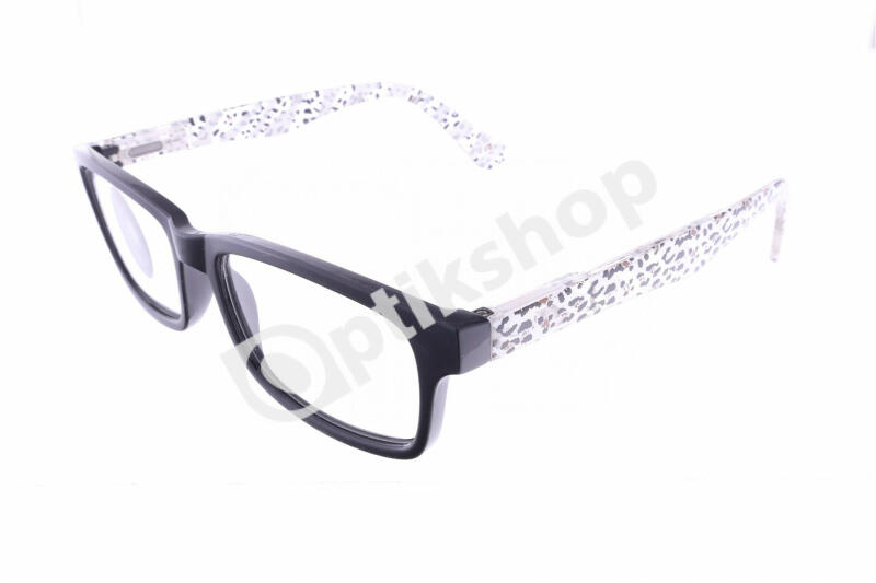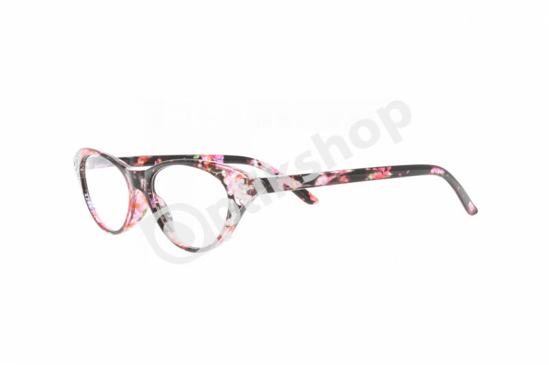 +1,00, kész Olvasószemüveg. Műanyag, fekete alapon színes virágmintás, extrém formájú keret. Front részén kövekkel díszített. Szárai rugósak.