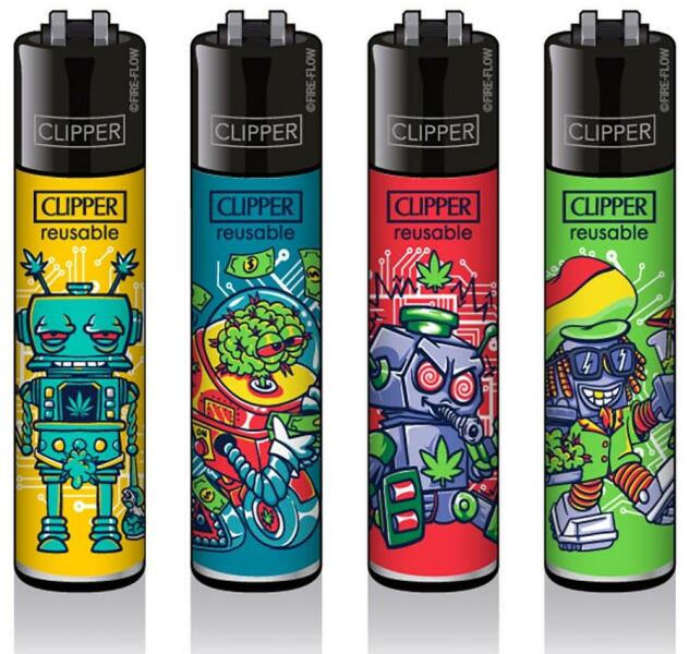 Clipper öngyújtók a 420 Robots nevű gyűjtő kiadásból. Az öngyújtók színes nyomtatással és kendermotívumokkal vannak ellátva. Minden egyes gyűjtői Clipper öngyújtó, a minőségi nyomtatás mellett, kiváló minőségű és erős nejlonból készül, így ellenáll a durva kezelésnek vagy akár egy kisebb esésnek is. Az öngyújtók előre beállított lángmagassággal rendel