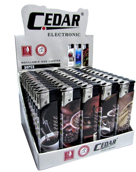 Cedar Elektromos Öngyújtó Kávés mintával 50db-os kiszerelésben A "puha(soft) lángú" öngyújtó egy kényelmes és könnyen használható eszköz gyertyák, cigaretták és egyéb anyagok meggyújtásához. Úgy tervezték, hogy könnyű és hordozható legyen, lágy lángja pedig szellővé teszi a gyújtást. Kiváló minőségű anyagokból készült, tartós műanyag házzal és kény