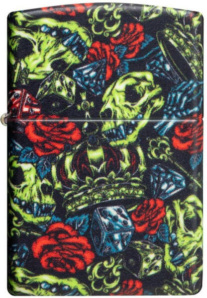 Zippo Skull Crown Design 49696-000003 öngyújtó. A mintát egy Glow-In-the-Dark öngyújtóra nyomtatták, amely sötétben fluoreszkál zölden világít. Zippo 540 Color eljárás, amely lehetővé teszi az öngyújtó felületének teljes lefedését precíziós grafikával. Eredeti Zippo, USA-ban készült öngyújtó Minden Zippo öngyújtó szélálló kivitel gyakorlatilag bárhol működ