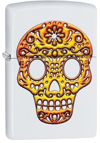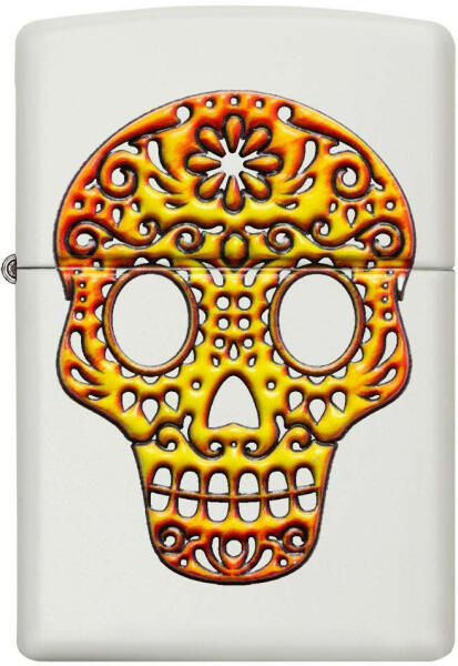Benzines vihargyújtó Zippo az elején domború mexikói cukor koponya motívummal, fehér színű öngyújtó nemesacél házzal készült. A benzinnel tölthető Zippoval semmi más ...