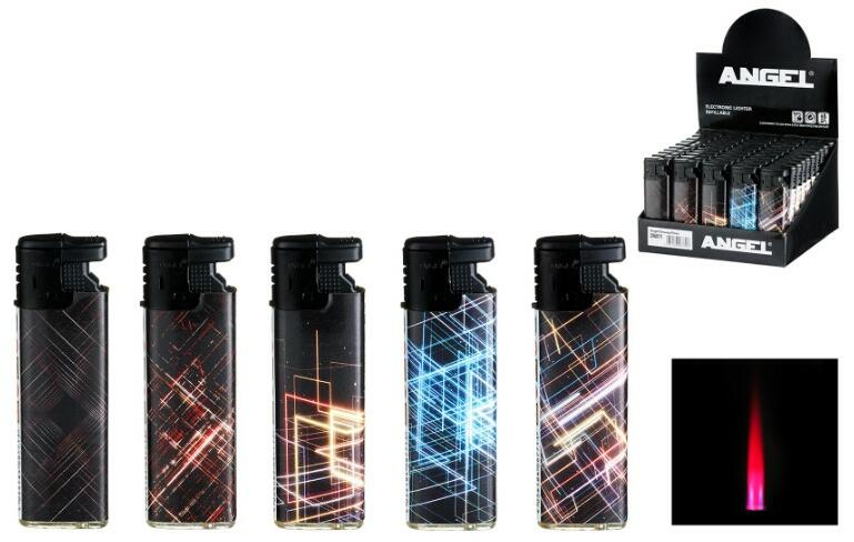 Angel márkájú újratölthető öngyújtó színes vonalmintával, a tálca 5 különböző mintájú öngyújtót tartalmazz fajtánként 10 darabot. A láng állítható és Piezzó ...